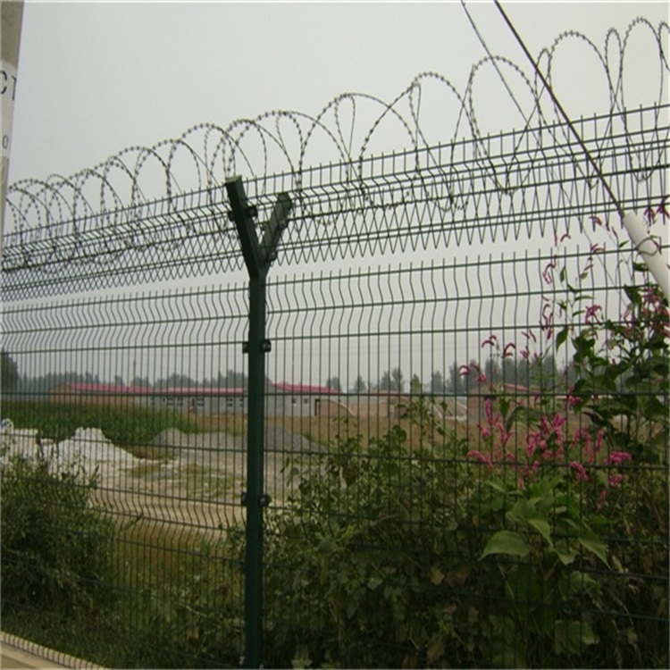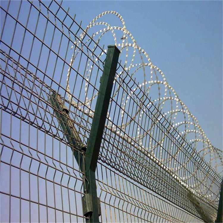在機場護欄網(wǎng)頂部安裝刀片刺籠,很好的增加了安全防護性能,由V形支柱、焊接網(wǎng)和緊固件組成,不易變形。