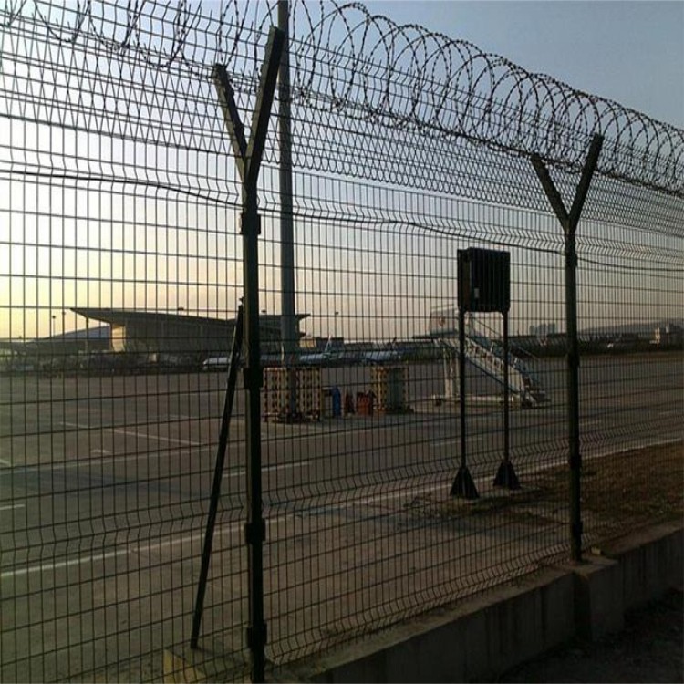 機場是一個對安全性要求高的場所,所以防護欄對于機場而言就是牢固的外墻。機場鋼筋網(wǎng)圍界又稱作“Y型安全防御護網(wǎng)”,是由折彎網(wǎng)片,V型支架立柱,加強型焊接片網(wǎng),上面有刀片刺繩(又稱刀片網(wǎng),刀片護欄)安全防盜連接件組成強度和安全防御性級別很高。被廣泛應(yīng)用在機場,基地等安全場所。