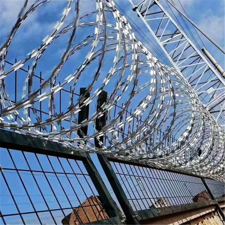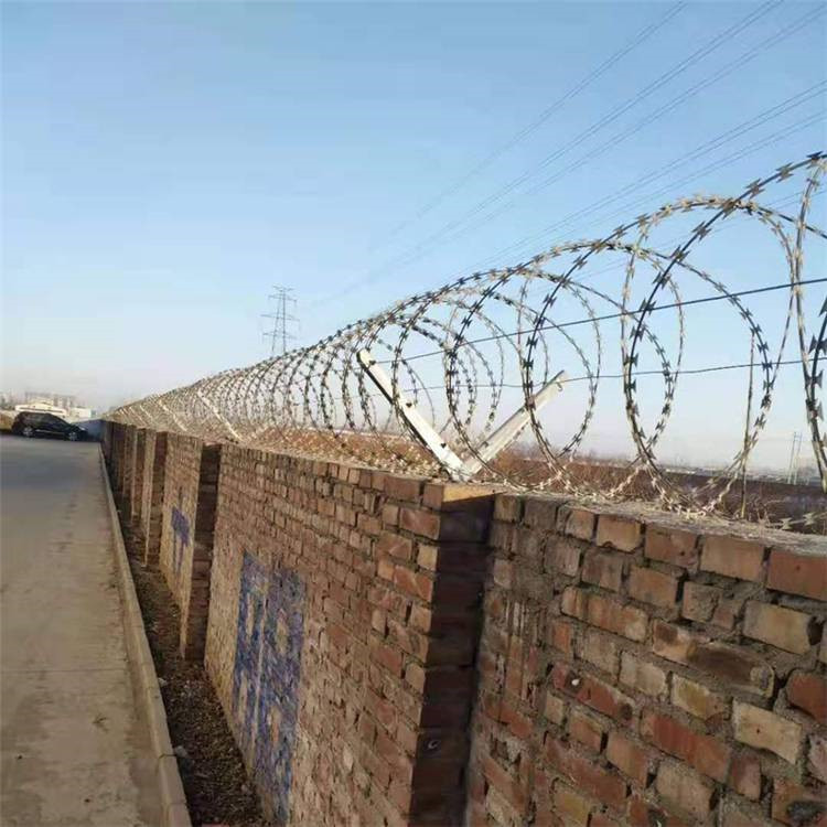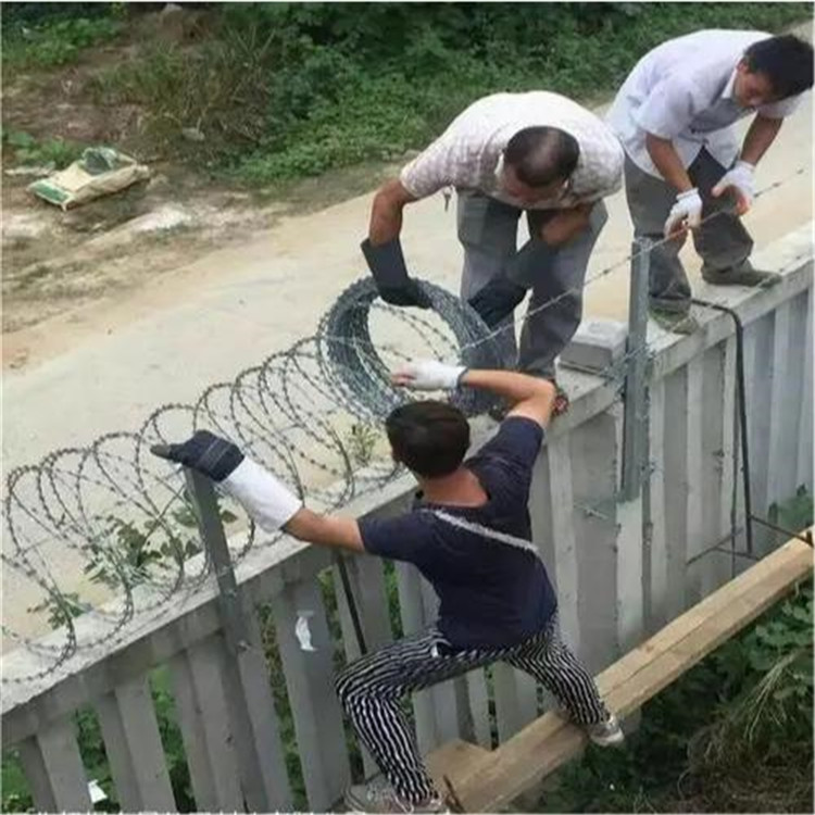 工程案例刀刺網(wǎng)根據(jù)實際使用場景的不同,采用不同的安裝方式。可以借助相關(guān)支架用以架設(shè)拉線,再用綁絲或者卡扣固定將刺絲滾籠固定與拉線上;也可以用扁鐵壓條直接將刺絲滾籠固定于墻體上;或者直接用綁絲固定在現(xiàn)有圍欄設(shè)施上。