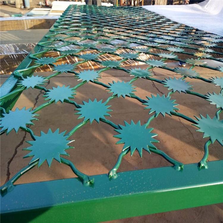 新聞動態(tài)1、梅花刺片護(hù)欄網(wǎng)又名太陽花刺片隔離網(wǎng),為太陽的后裔單層梅花刺片網(wǎng),直徑不小于7.5cm,刺片厚1.5mm,采用Q235低碳鋼板沖壓成型。