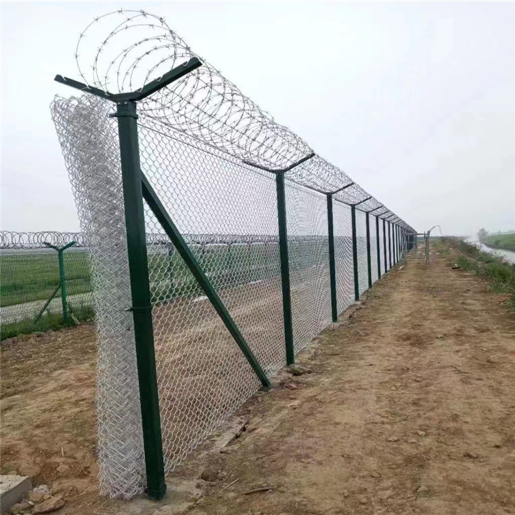 鋁包鋼機(jī)場圍界主要用于機(jī)場外圍的防護(hù)使用,是一種新型機(jī)場圍界防護(hù)網(wǎng),又被稱作鋁包鋼機(jī)場圍欄。鋁包鋼絲機(jī)場護(hù)欄具有獨(dú)具匠心的鋼絞線穿插式連接立柱和網(wǎng)片,由Y型立柱、鋁包鋼勾花網(wǎng)、鋁包鋼刺絲網(wǎng)組成。 鋁包鋼機(jī)場圍界具有美觀實用、防腐性好、無需保養(yǎng)、防攀爬能力強(qiáng)、方便運(yùn)輸和安裝等特點(diǎn),關(guān)鍵的是鋁包鋼絲機(jī)場護(hù)欄可以使用30年以上,強(qiáng)度可達(dá)600Mpa。主要適用于機(jī)場周圍的隔離防護(hù),美化及防翻越工程,目前基本都是定制生產(chǎn)。