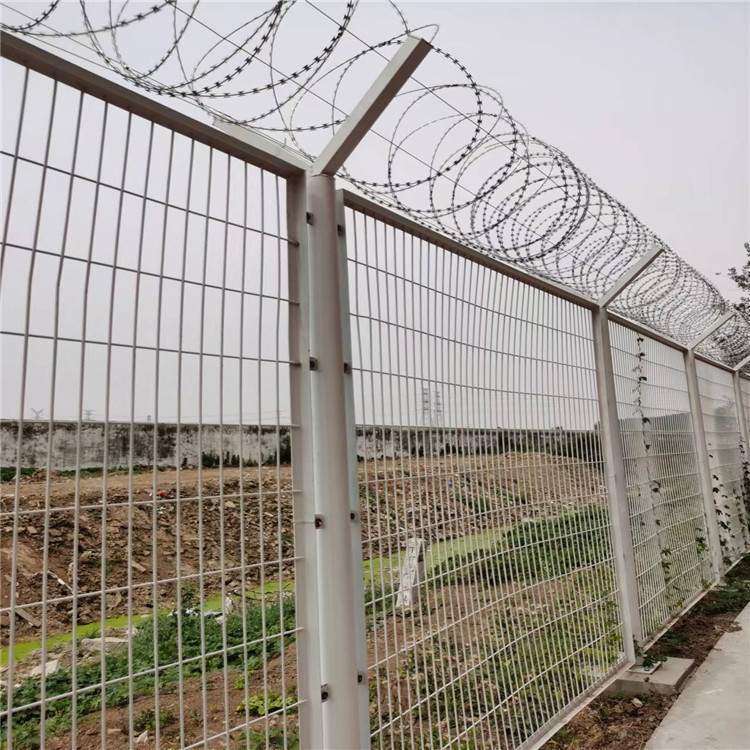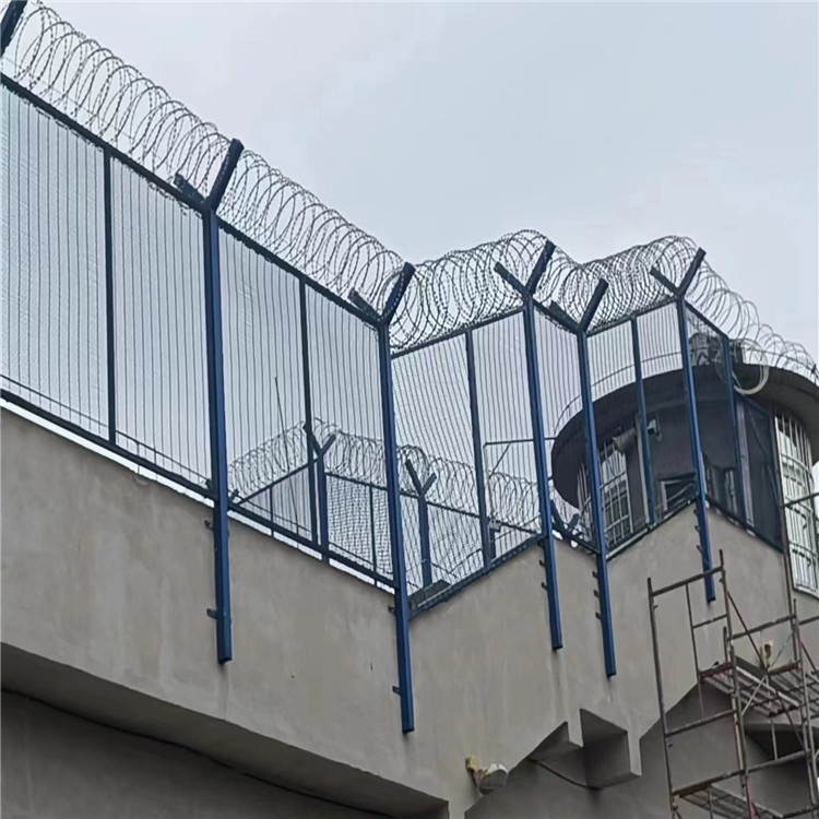 監(jiān)獄隔離網(wǎng),主要是采用頂部防爬刀片刺網(wǎng)與高強(qiáng)度防護(hù)網(wǎng)的結(jié)合,由V型支架立拄,加強(qiáng)型焊接片網(wǎng),安全防盜連接件和刀片刺網(wǎng)組成。具有嚇阻、防翻越等效果,材質(zhì)堅(jiān)硬,高強(qiáng)度,高張力,造型設(shè)計(jì)獨(dú)特,不宜觸摸,因而能達(dá)到極好的防護(hù)隔離效果